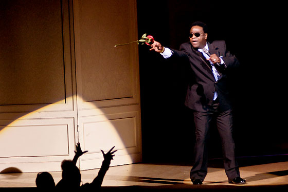 But if you think the Rev. was letting his employees do most of the heavy lifting, you're wrong. Despite his age, he hasn't lost a step as a vocalist. He can croon his hits (and other folks' too) as smoothly as he did 30 years ago. He can command your attention and quiet the room instantly by taking his creamy voice down to a hush. And he can still make your hair stand on end with his screeching falsetto, hitting notes that even Robert Plant's dog can't hear. At one quiet point, he moved several steps off-mike and cut loose with a note that could easily be heard from my seat at the back of the hall. On top of all that, he still knows how to work a room. He got down to shake it with his dancers. He doffed his coat repeatedly like James Brown shrugging off his cape. And over the course of the evening, he gave out more of those roses than a polygamist on Valentine's Day. Whoever his florist is, they're making a mint.